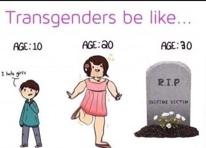 Les mèmes anti-transgenres postés en ligne ont souvent pour thème central le suicide. Dans la plupart des cas, ces références utilisent des statistiques indiquant des taux de suicide plus élevés dans la communauté transgenre pour dépeindre les identités transgenres comme étant liées à une maladie mentale ou comme étant dangereuses. Dans les espaces plus extrêmes, ces références sont également utilisées pour banaliser ou célébrer la mort de personnes transgenres.